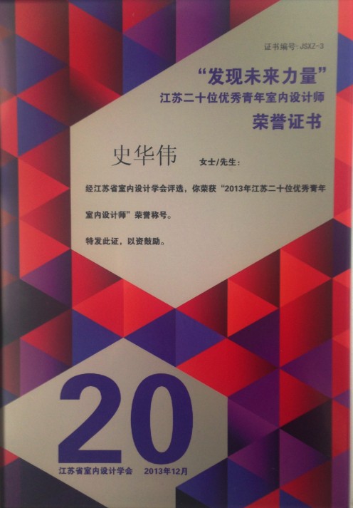 2014年1月22日下午,2013年度江苏省室内设计学会颁奖盛典在永隆家居圆满举行,中国建筑学会室内设计分会组织各专业委员会评选本地区优秀青年室内设计师的基础上,以“发现未来力量”为主题,提倡作品原创性,经过省学会、专家严格评审,进一步评选出“江苏省二十位优秀青年设计师”, 公司史华伟教师脱颖而出,获得2013年度江苏省优秀青年设计师荣誉称号,展现了公司教师的风采与底蕴。