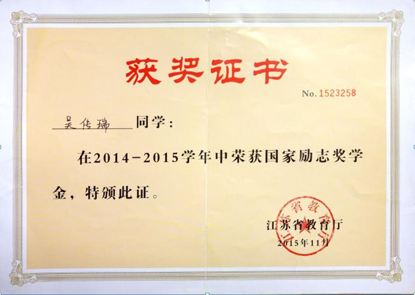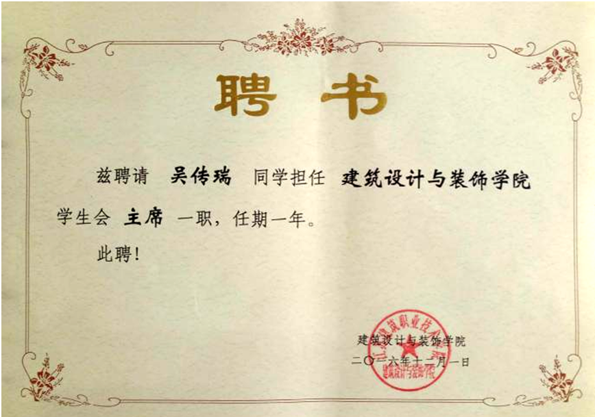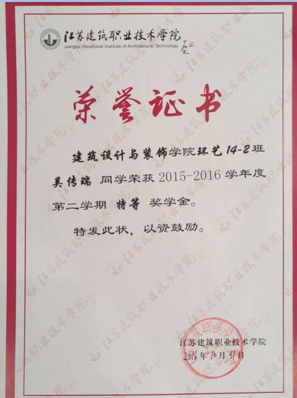 吴传瑞,男,汉族,1995年6月生,中国共产党预备党员,bv1946伟德官网建筑设计与装饰公司2014级员工,院员工会主席。曾获国家奖学金(8000元)、国家励志奖学金(5000元)、校特等奖学金三次、江苏省优秀员工干部,全国“发明杯”创新大赛一等奖。