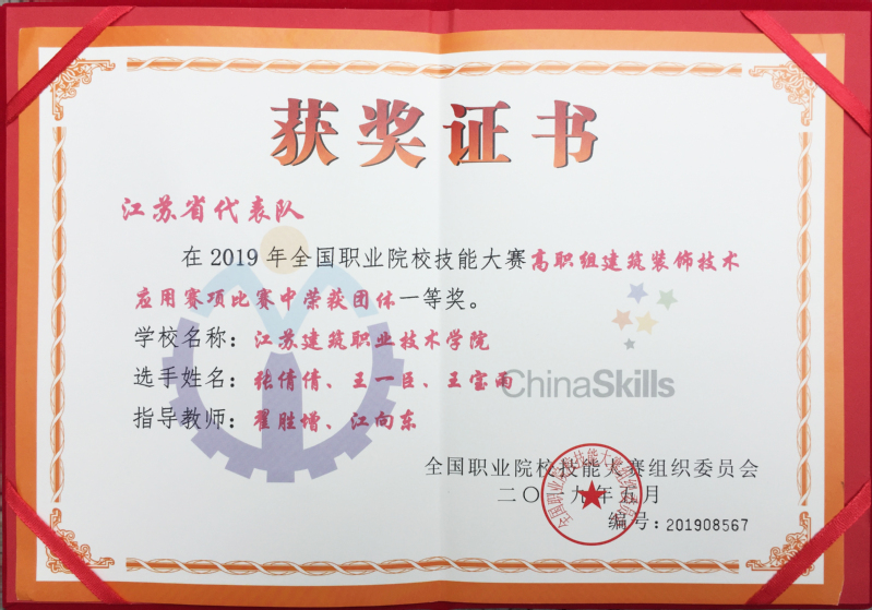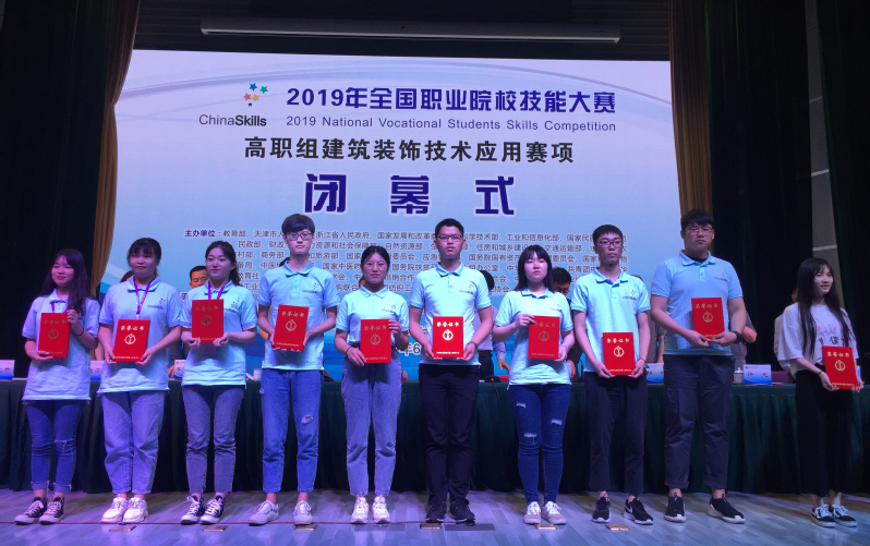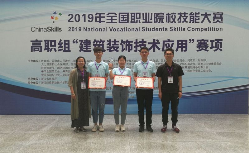 5月31日-6月2日,由教育部等30余家单位联合主办的2019年全国职业院校技能大赛高职组首届“建筑装饰技术应用”赛项在浙江杭州举行,来自全国79所高职院校的237名选手参赛。公司由bv1946伟德官网翟胜增、江向东两位老师指导的装饰16级张倩倩、王一臣、王宝雨3名同学组成的江苏省代表队经过激烈角逐,最终以总分第一名成绩荣获国赛一等奖。