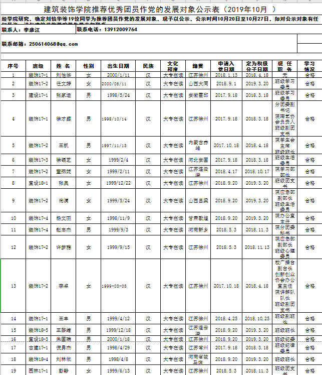 bv1946伟德官网推荐优秀团员作党的发展对象公示表(2019年10月 )