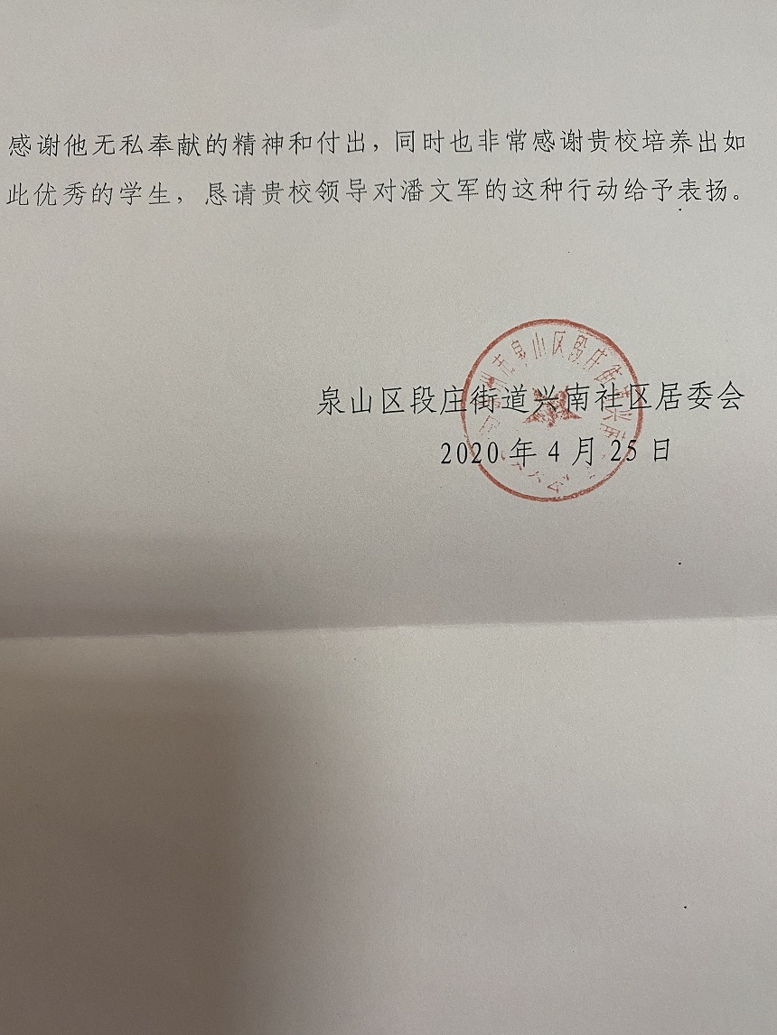 近日,公司收到泉山区段庄街道兴南社区居委会的一封表扬信,来信指出公司员工园林17-1班潘文军同学在防控疫情期间主动加入兴南社区疫情防控阻击队,用自己的实际行动为兴南社区疫情防控工作作出了贡献,展现了当代青年应有的担当和奉献精神,对公司能培养出如此优秀的员工表示感谢。