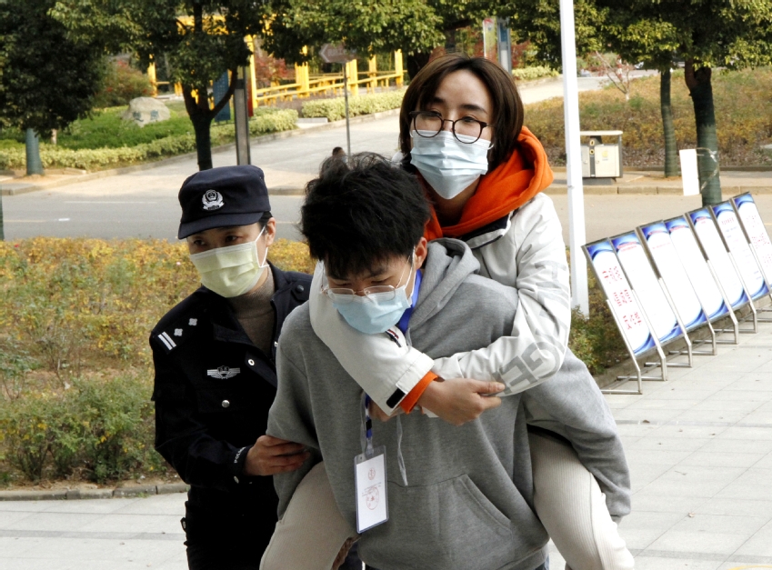 正在这时,担任“法考”志愿者的汪义同学见此情景,快速跑过来替换曹警官,背起小朱来到安检通道。在考务工作人员搀扶下,小朱顺利通过安检。随后,汪义一口气又把小朱背上四楼的第21考场,在开考前到达指定考场。小朱坐到考试座位上,眼神里流露着感激。她感动地对曹警官和汪义说:“谢谢阿姨、弟弟,我一定好好考试,争取通过‘法考’,用自己所学的法律知识来帮助更多的人。”
