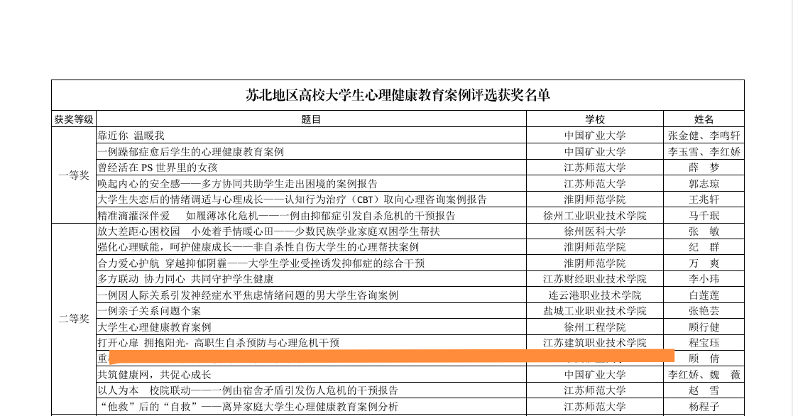 在刚刚结束的苏北地区老员工心理健康教育案例比赛中,公司专职辅导员程宝珏老师报送《打开心扉拥抱阳光——高职生自杀预防与心理危机干预》案例荣获二等奖。