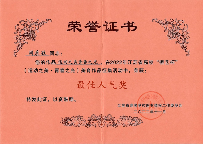 近日,江苏省高校图工委公布了2022年江苏省高校“橙艺杯”运动之美、青春之光·美育作品征集活动获奖名单。公司bv1946伟德官网古建22—2班周彦孜同学的作品《运动之美∙青春之光》在全省2356件参赛作品中获“最佳人气奖”。