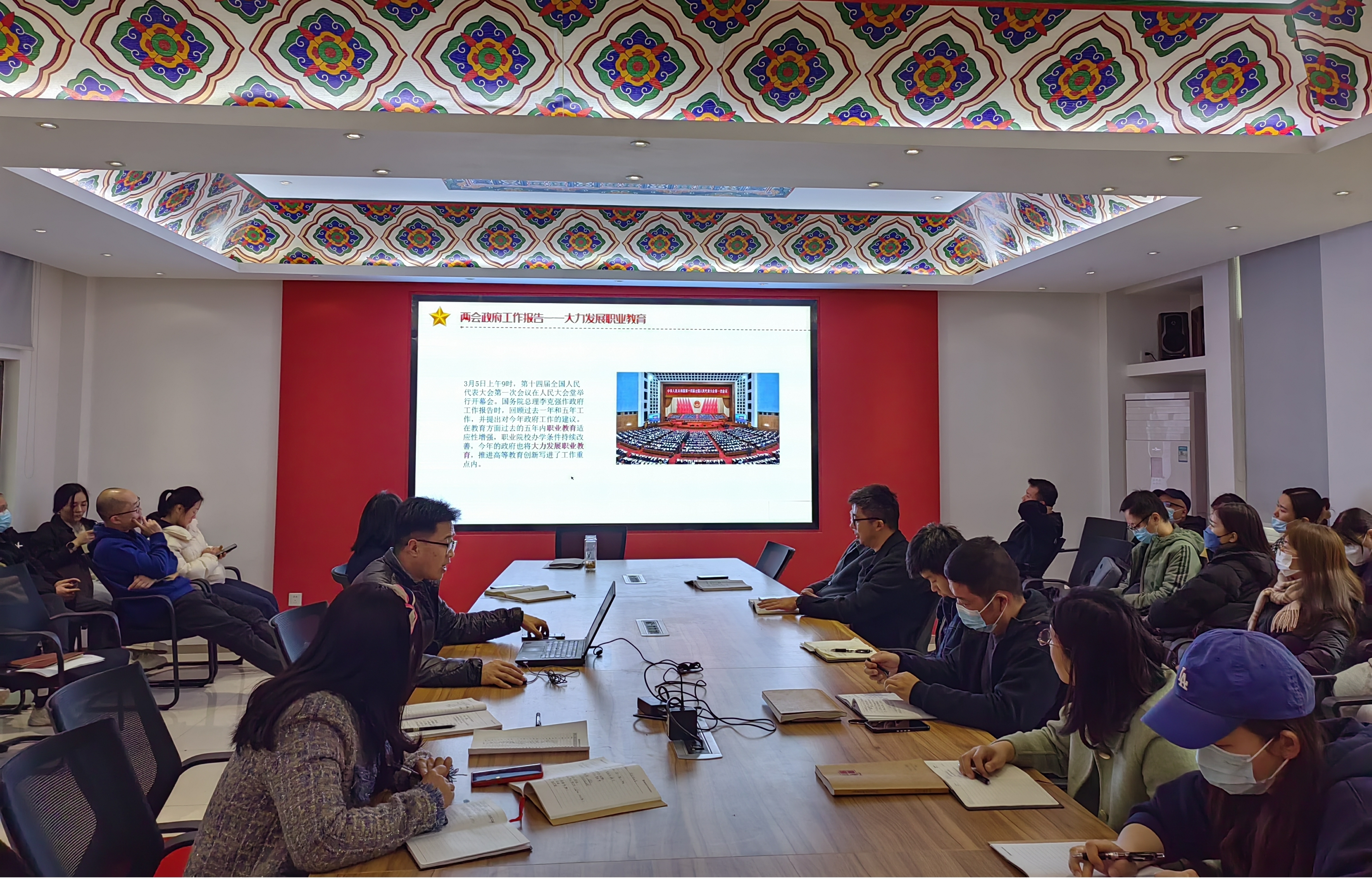 3月21日下午,建筑装饰公司组织教职工政治学习第二专题——传达学习2023全国两会精神。党总支书记娄志刚主持会议,公司全体教职工参加学习。