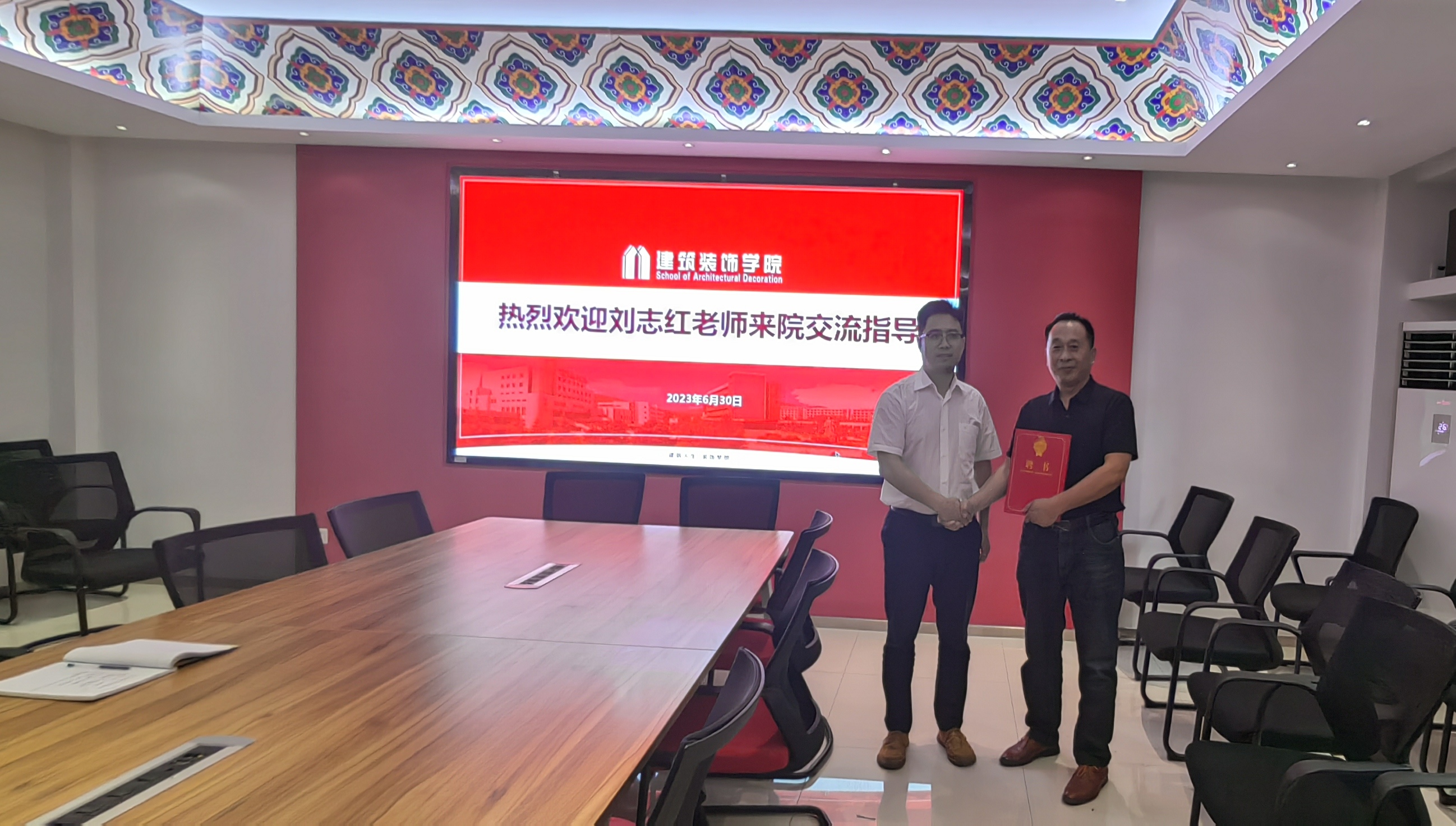 娄志刚首先向刘志红经理一行表示热烈欢迎并结合公司发展、专业设置、员工培养、校企合作、劳动教育等方面详细介绍公司基本情况。随后,娄志刚为刘志红老师颁发了客座教授聘书并开展赠画仪式。