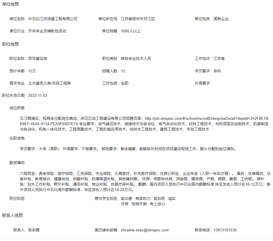 中石化江苏油建工程有限公司招聘简章