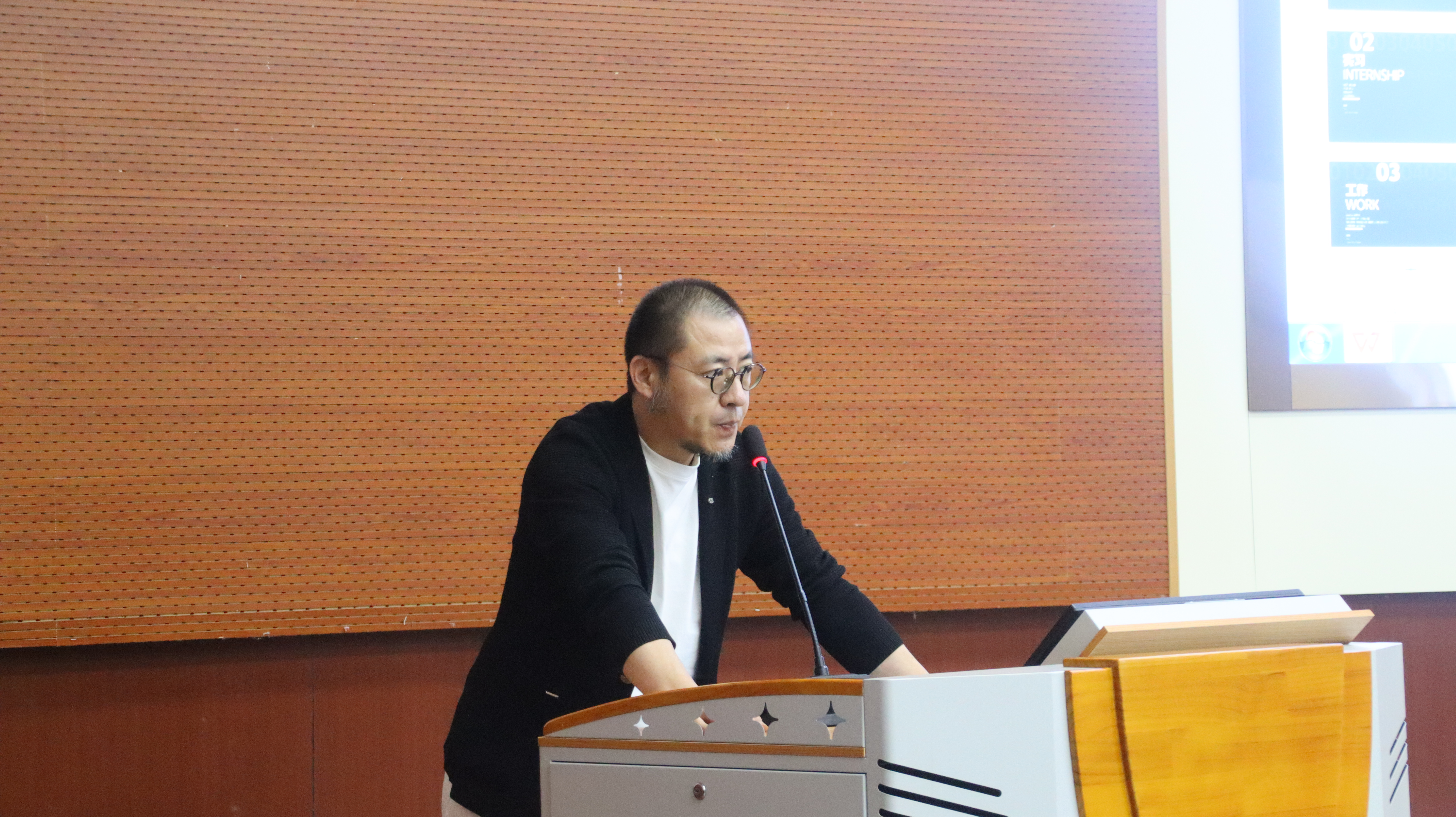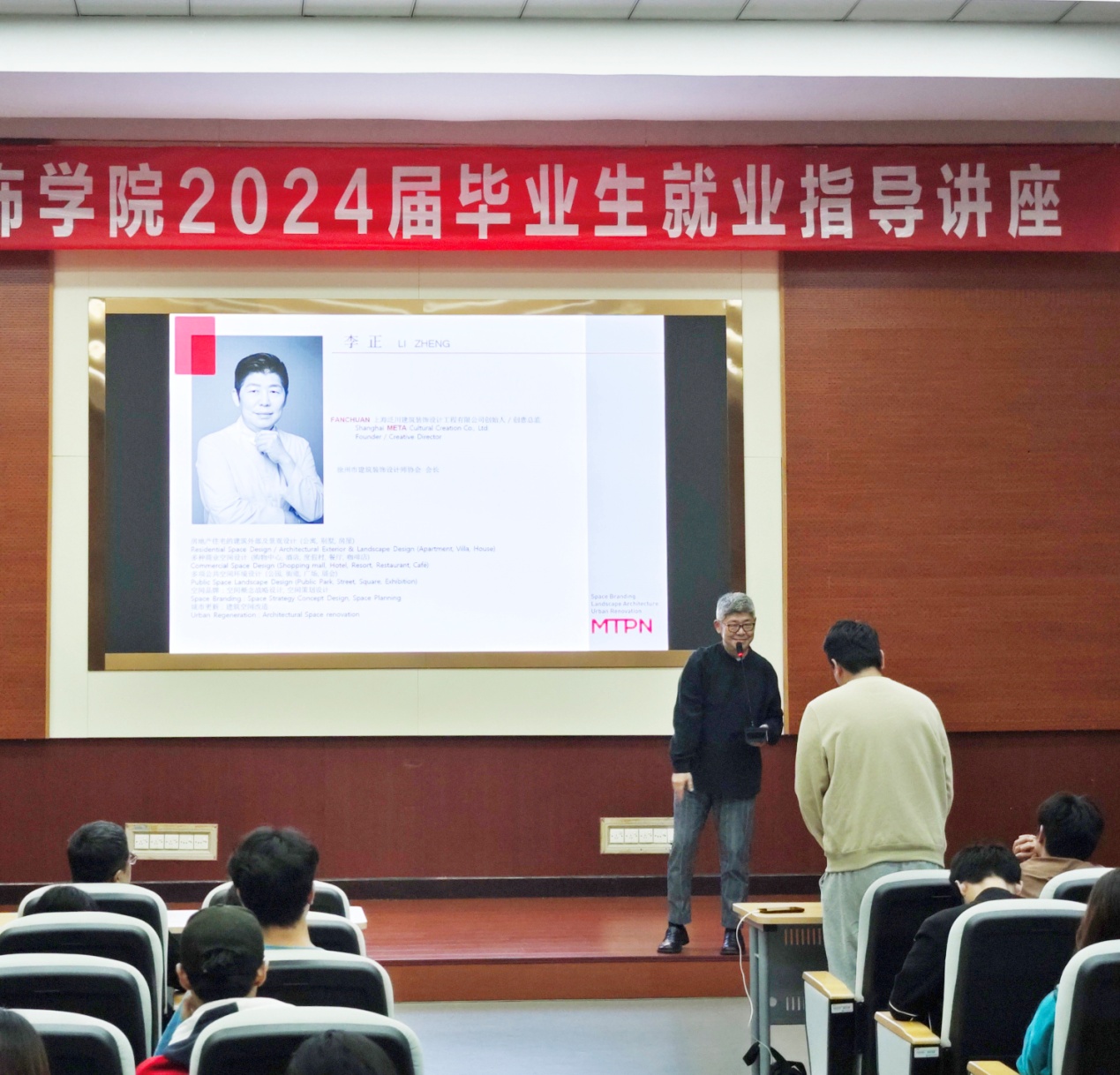 优秀员工张江波“从发现这座城市开始”为题,从“思考有趣的世界”、“发现场所精神”、“发现身边的有趣”三个模块出发,讲述了城市街道、建筑以及中国古代传统建筑的设计创意点。并结合案例,引导毕业生要主动观察周围世界、探寻建筑设计之美,激发自己的设计灵感。他希望同学们不断提高专业素养,不断吸收优秀传统文化,精益求精,努力成长为有道德、有追求、有技术的新时代设计师。