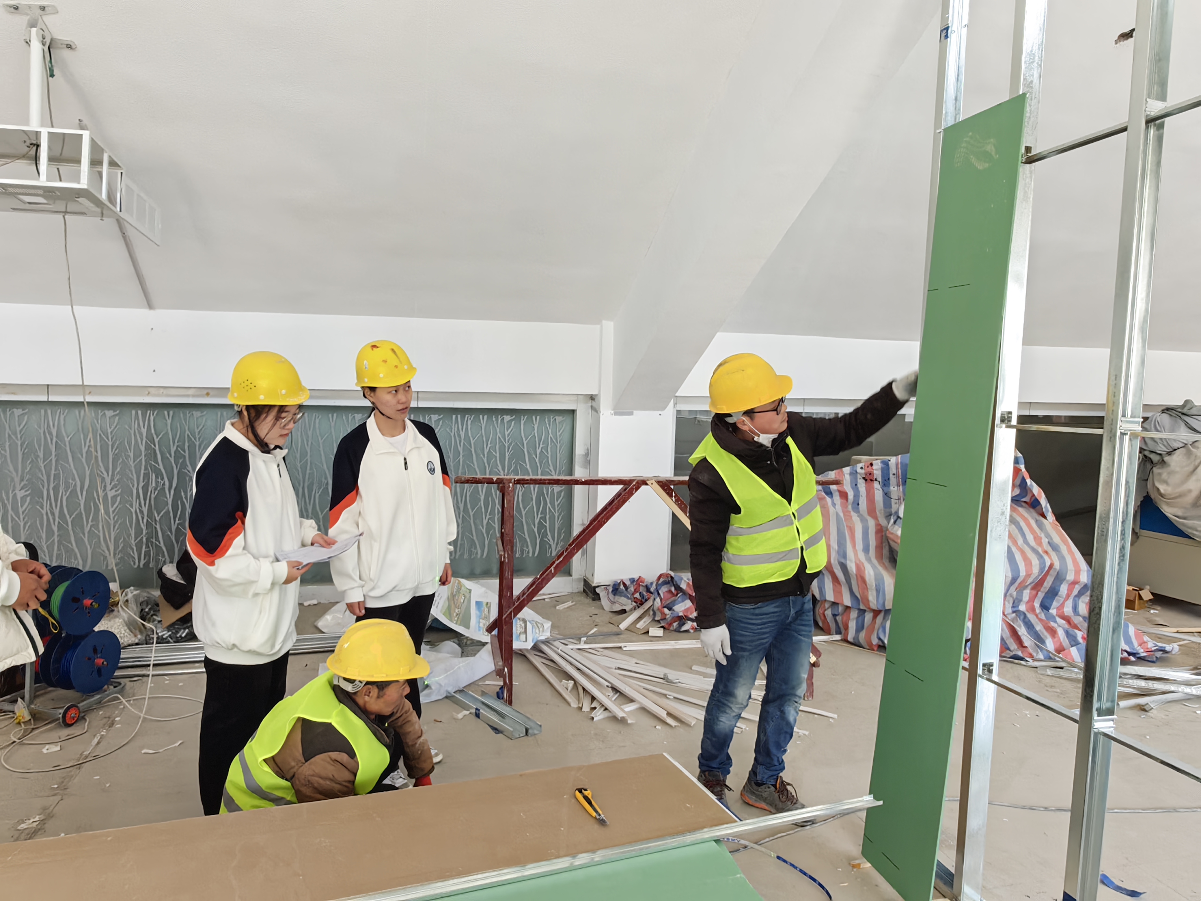 作为bv1946伟德官网重点打造的生产性实践载体,数字装饰工程训练中心建设全过程贯彻“做中学、学中做”的育人理念,构建起“大三做设计、大二进现场、大一学识图、教师强指导”的共学共建模式。项目启动以来,大三员工团队在教师指导下完成施工图深化设计;大二员工进驻工地开展测量放线、材料加工等实操;大一新生通过现场观摩学习图纸识读,形成完整的实践能力培养链条。目前开展的墙面工程阶段,通过专业课教师驻场指导,企业工程师同步进行技术交底的方式,师生共同参与材料选型、工艺制定等全流程环节,真正实现“教室与工场合一、教师与师傅合一、员工与学徒合一”。师生已协同完成轻钢龙骨隔墙安装、石膏板封板等关键工序。
